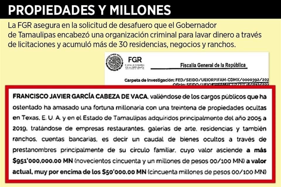 El Gobernador de Tamaulipas, el panista Francisco Javier García Cabeza de Vaca, amasó una fortuna de 951 millones de pesos, según documentó la Fiscalía General de la República (FGR).