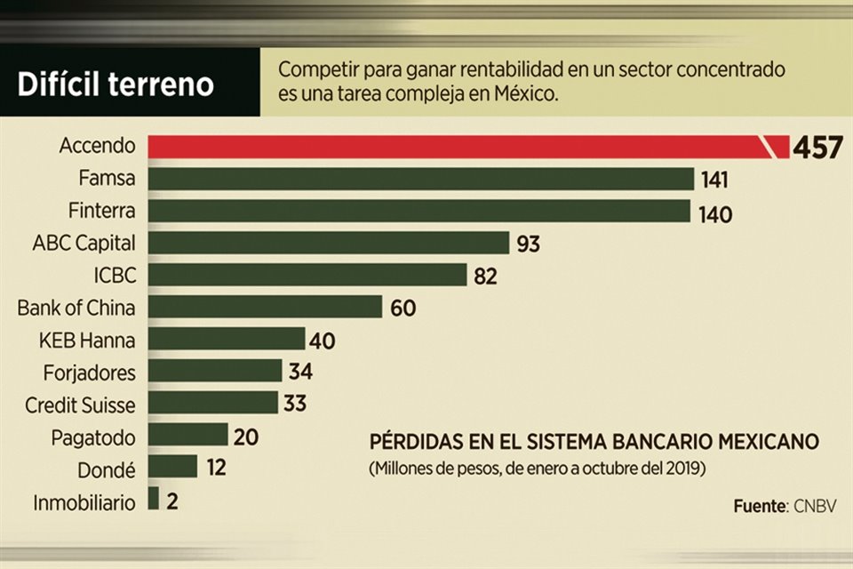 En el periodo de enero a octubre de 2019, una docena de los 51 bancos que operan en México presentaron pérdidas, según los datos más recientes de la Comisión Nacional Bancaria y de Valores (CNBV).