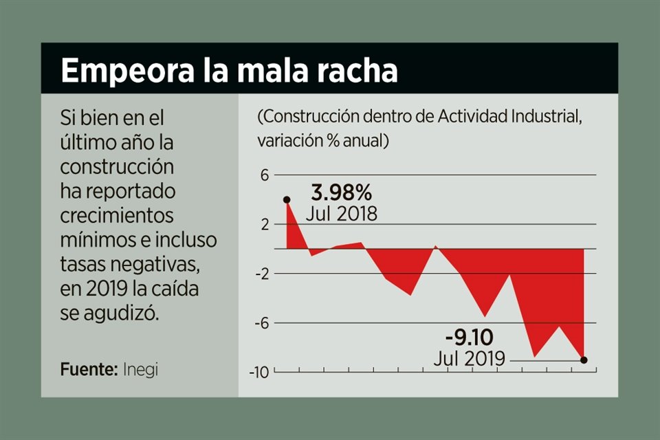 En lo que va de año, la industria de la construcción reporta una caída acumulada de 5.71 por ciento, con reducciones cada mes más profundas.