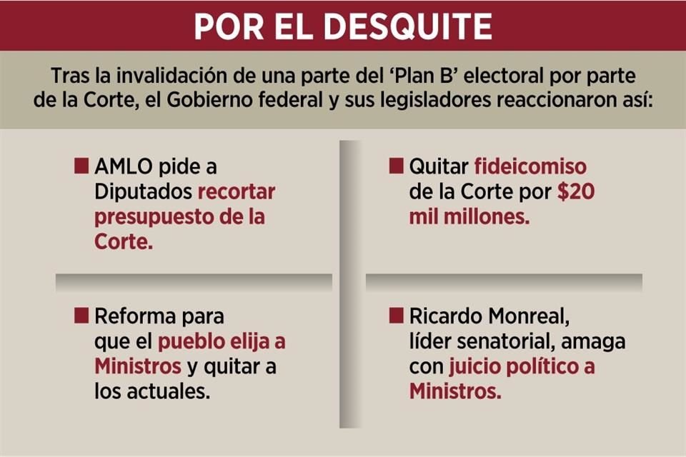 Molesto porque el Poder Judicial "corrige la plana" al Legislativo al invalidar del "Plan B" electoral, el Presidente Andrés Manuel López Obrador advirtió ayer que la Cámara de Diputados debe revisar el presupuesto de la Corte para reducir ingresos a ministros.