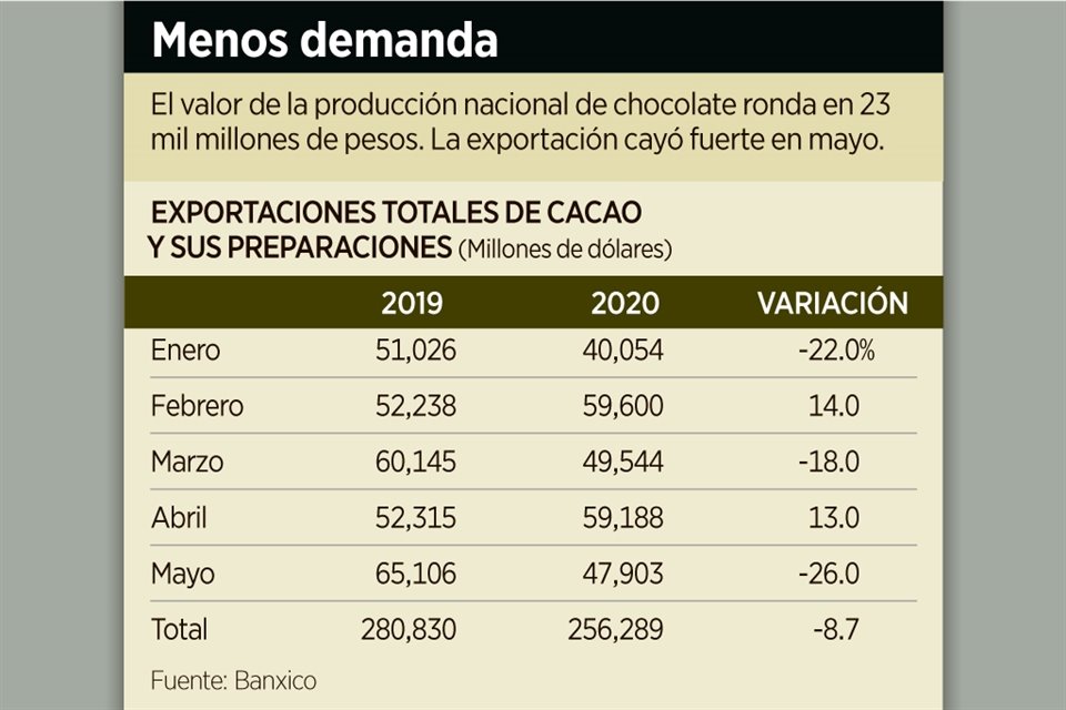 Durante los primeros cinco meses del año, las ventas mayoristas de chocolate de confitería cayeron 4 por ciento y el valor de exportación de cacao y sus preparaciones disminuyó 8.7 por ciento, según análisis de Iscam y datos de Banxico.