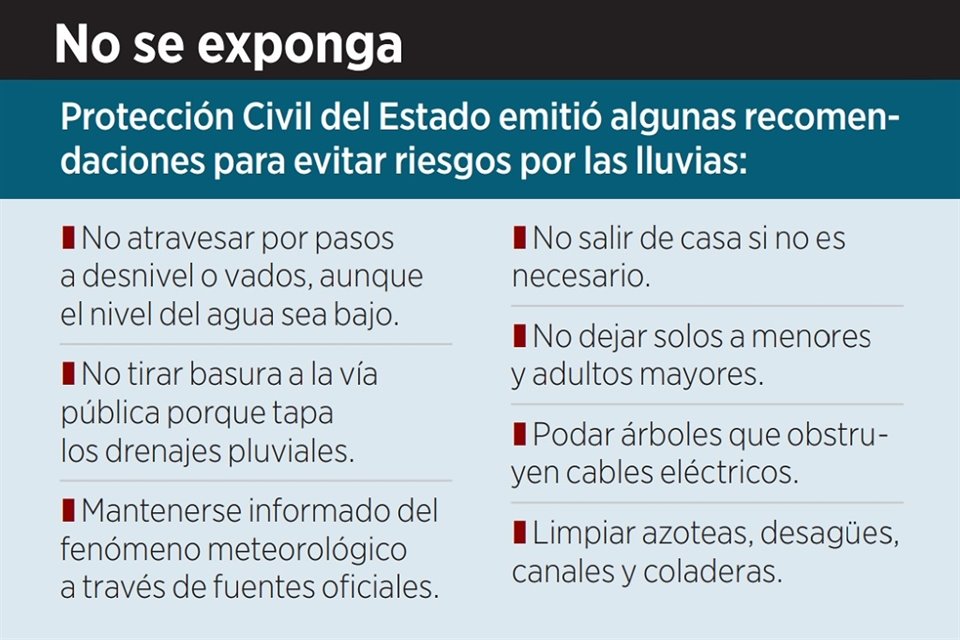 Ante las fuertes lluvias que se esperan desde hoy y hasta el jueves en Nuevo León, Protección Civil estatal alertó a tomar precauciones, atender las indicaciones de las autoridades y sacarle la vuelta a zonas inundables.