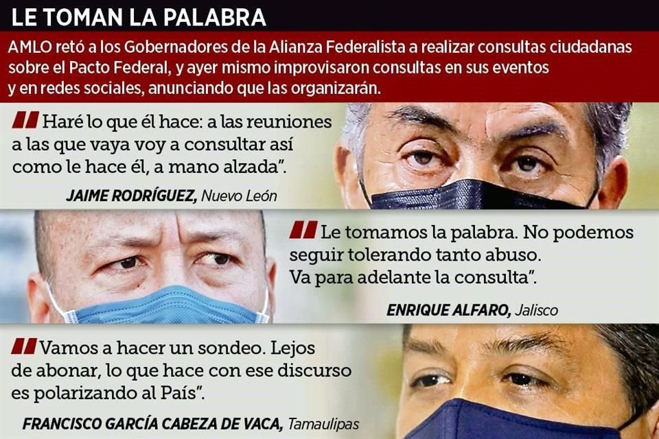 Los 10 Estados que integran la Alianza Federalista, que incluye a Nuevo León, tomaron ayer la palabra al Presidente Andrés Manuel López Obrador y anunciaron que consultarán a sus ciudadanos -incluso al "estilo AMLO": a mano alzada- si desean salir del Pacto Fiscal ante el trato inequitativo que reciben.