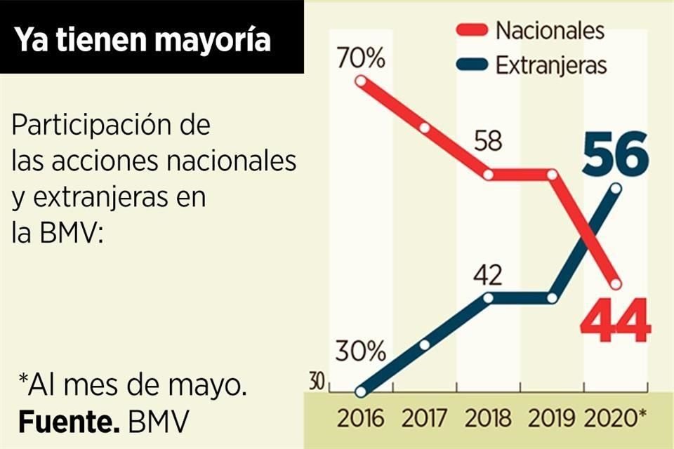 En un fenómeno atribuido a la incertidumbre por las políticas del Gobierno mexicano y al creciente interés por diversificar inversiones, el 56 por ciento de las operaciones en la Bolsa Mexicana de Valores (BMV) durante el pasado mes de mayo correspondió a acciones de empresas extranjeras, principalmente de Estados Unidos.