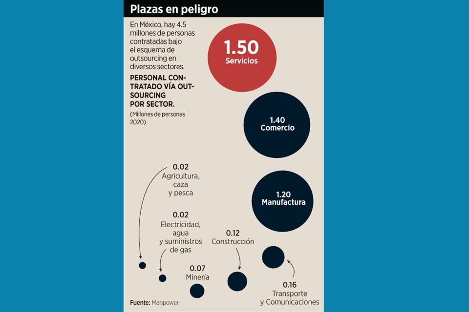La prohibición del outsourcing podría afectar de inicio a 4.5 millones de personas que se encuentran contratados bajo este esquema, advirtió Pablo Lezema, presidente de la Asociación Mexicana de Empresas de Capital Humano (AMECH).