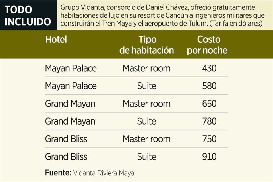 Grupo Vidanta, propiedad de Daniel Chávez, puso a disposición del Ejército 40 habitaciones de lujo, algunas de ellas con un precio de 910 dólares la noche, para que las usen de forma gratuita en su complejo turístico de Cancún durante la construcción del Tren Maya y el aeropuerto de Tulum.