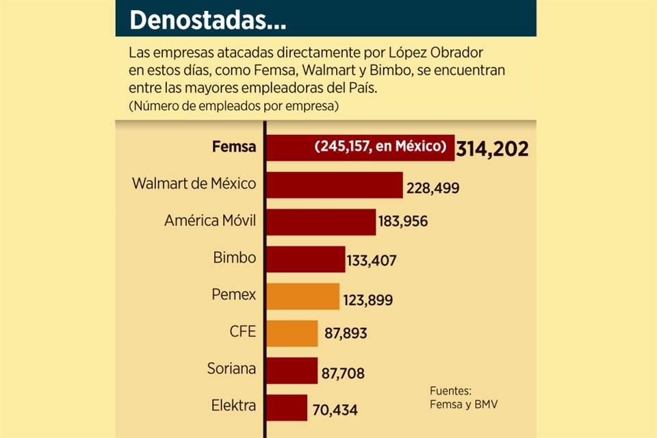 El Presidente Andrés Manuel López Obrador volvió a arremeter ayer contra Femsa, que es el mayor empleador del País, debido a que sus tiendas Oxxo pagan poco por la electricidad que consumen, desconociendo que se autoabastecen con plantas privadas, que en nada dañan a la CFE, ni al erario.