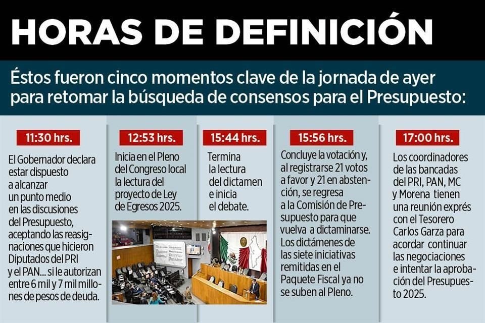 El Presupuesto de Egresos 2025 registró ayer un tropiezo en el Congreso al no alcanzar los votos necesarios para su aprobación, lo que derivó en que regresara a la Comisión de Presupuesto para volver a dictaminarse y llevó al Gobierno del Estado y al Congreso local a retomar las negociaciones para un acuerdo.