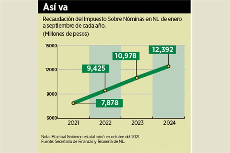 En el acumulado de enero a septiembre de este año, Nuevo León recaudó 12 mil 392 millones de pesos por concepto del Impuesto Sobre Nóminas (ISN), un alza de 12.8 por ciento nominal a tasa anual, de acuerdo con el reporte del tercer trimestre de la Cuenta Pública del Estado.