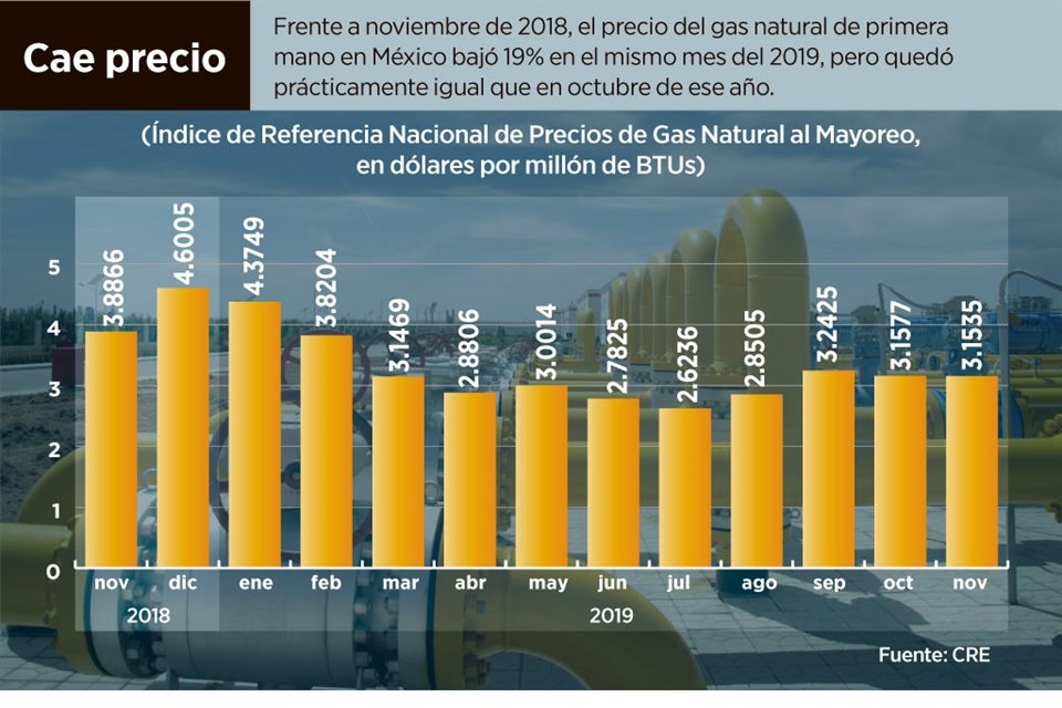 El precio del gas que venden mayoristas a compañías como Naturgy cayó en noviembre pasado 19 por ciento en promedio respecto al mismo mes del 2018.