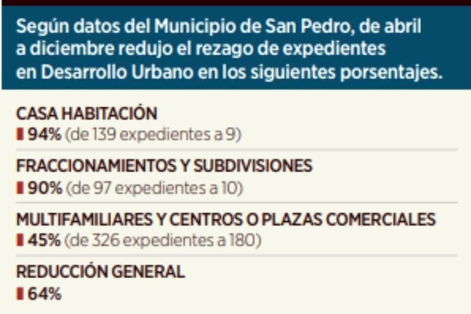 El Municipio de San Pedro reportó que en ocho meses ha logrado reducir el rezago en la Secretaría de Desarrollo Urbano en un 64 por ciento general.
