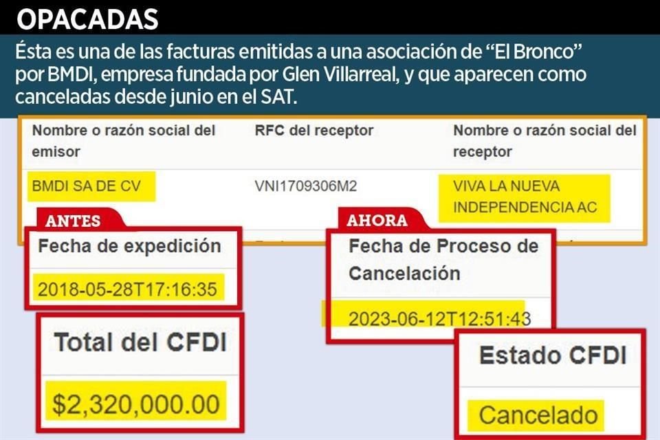 Cinco años después de haber sido expedidas y haber estado vigentes, al menos dos de las 14 facturas hechas por BMDI -empresa fundada por el emecista Glen Villarreal- a la asociación civil Viva la Nueva Independencia, creada durante la campaña presidencial del ex Gobernador Jaime Rodríguez, aparecen como canceladas.