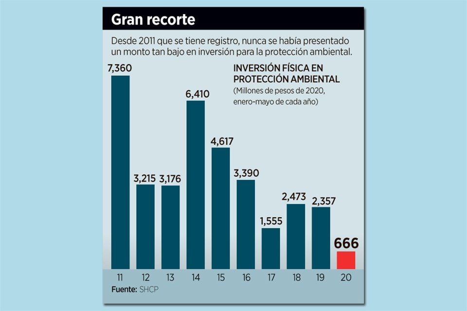 La inversión en protección ambiental cayó en 71 por ciento, de enero a mayo de 2020, frente al año pasado, con lo que acumuló su peor monto desde que se tiene registro.