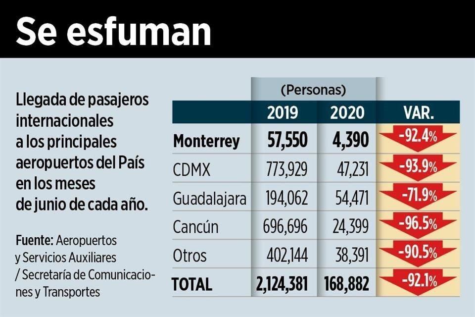 Los pasajeros internacionales desaparecieron del Aeropuerto internacional de Monterrey en junio pasado cuando, derivado de la emergencia del coronavirus, se desplomó en 92.4 por ciento su arribo, de acuerdo con cifras oficiales.