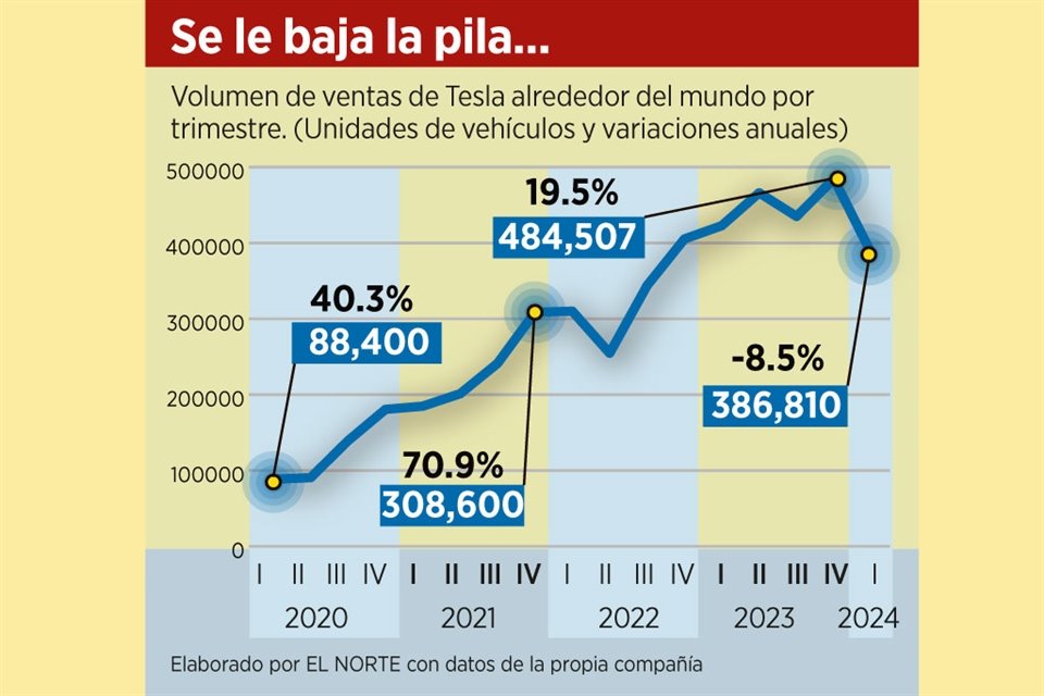 Durante el primer trimestre del 2024, Tesla registró una caída de 8.5 por ciento anual en el volumen de sus ventas, la primera desde la del segundo cuarto del 2020, asociada a la pandemia, reportó ayer la propia compañía.