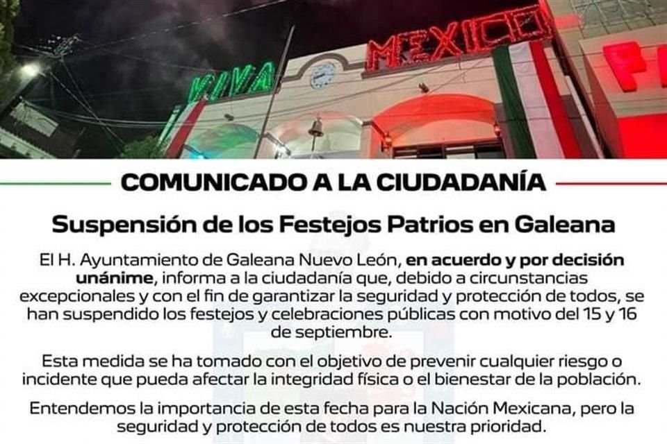 La ola de inseguridad que se vive en Galeana ha obligado a las autoridades municipales a cancelar los festejos por el Día de la Independencia.