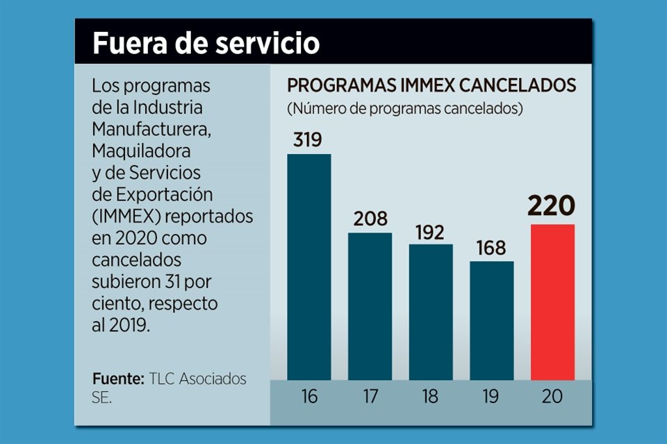 En la revisión que la Secretaría de Economía hizo este año a los programas de la Industria Manufacturera, Maquiladora y de Servicios de Exportación (IMMEX), cancelaron 220 programas, 31 por ciento más respecto a 2019.