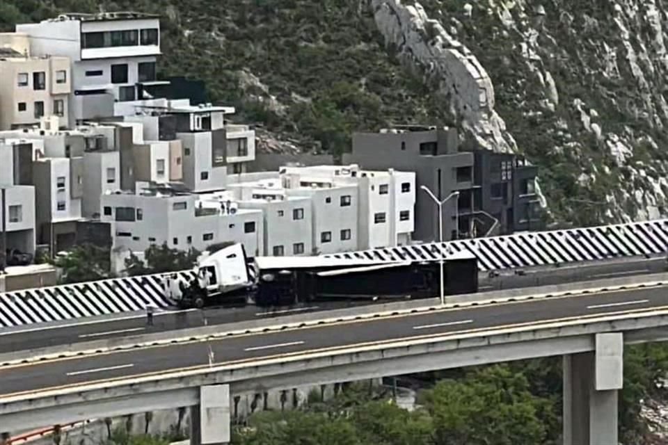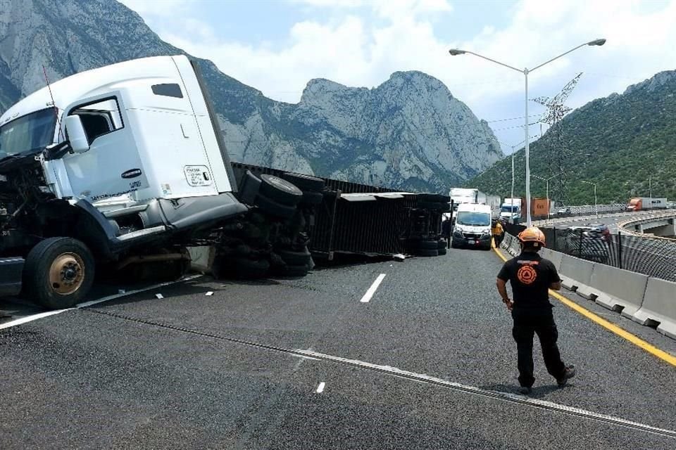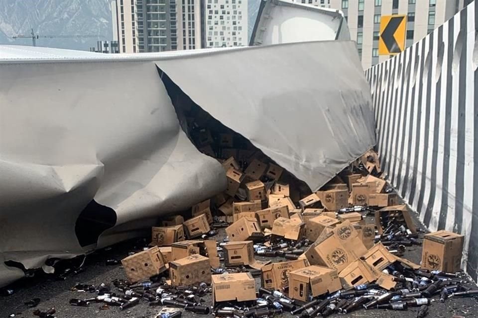 Luego de perder el control de su unidad, el conductor de un tráiler que transportaba cerveza perdió el control y estrelló su unidad contra el muro de contención de la Autopista Saltillo-Monterrey, donde quedó volcado, en Santa Catarina.