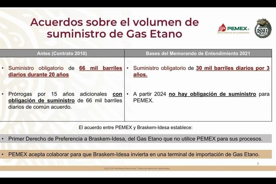 El Presidente Andrés Manuel López Obrador y el director de Pemex, Octavio Romero, anunciaron un acuerdo con Odebrecht que contempla reducir a menos de la mitad el suministro de gas etano a la planta de Braskem-Idesa en Veracruz, el cual presumieron generará un ahorro de 13 mil 749 millones de pesos.
