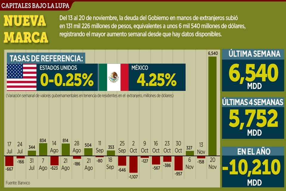 El pasado 20 de noviembre, último dato reportado por el Banco de México (Banxico), la tenencia de valores gubernamentales en manos de extranjeros aumentó en 131 mil 143 millones de pesos, equivalentes a unos 6 mil 538 millones de dólares, la mayor alza para un solo día desde que hay datos disponibles, a partir de 1991.