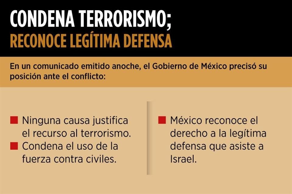 El Gobierno de México condenó ayer los ataques del grupo islamista Hamas, al considerarlos como terrorismo, en la Franja de Gaza y otras zonas en Israel, que han dejado más de mil muertos y al menos 150 secuestrados, entre ellos dos connacionales.