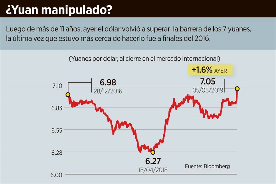 La guerra comercial entre China y EU se recrudeció luego de que en un primer capítulo de ayer el gigante asiático permitió devaluar su moneda a un nivel no visto desde hace más de una década.