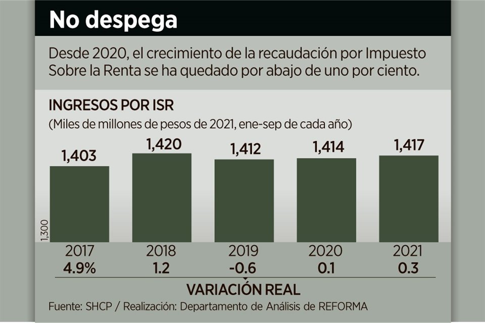 La recaudación del Gobierno federal por Impuesto Sobre la Renta (ISR) creció en los primeros nueve meses menos de uno por ciento por segundo año consecutivo.
