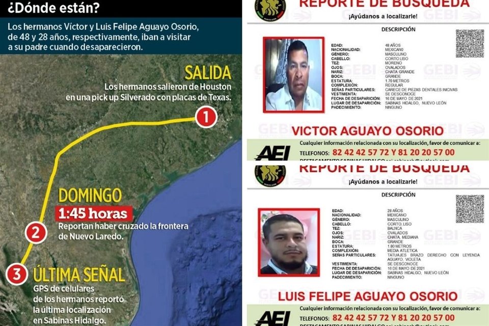 Dos hermanos que viajaban de Houston, Texas, a San Luis Potosí para visitar a su padre desaparecieron el domingo tras cruzar la frontera.