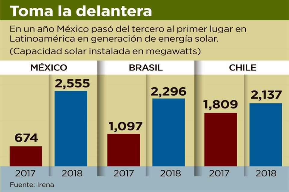 Al casi cuadruplicar la capacidad instalada de energía solar en tan solo un año y cerrar 2018 con 2 mil 555 megawatts, México se ubicó en el primer lugar de América Latina en materia de desarrollo de esta tecnología, según datos de la Agencia Internacional de Energías Renovables (Irena, por sus siglas en inglés).