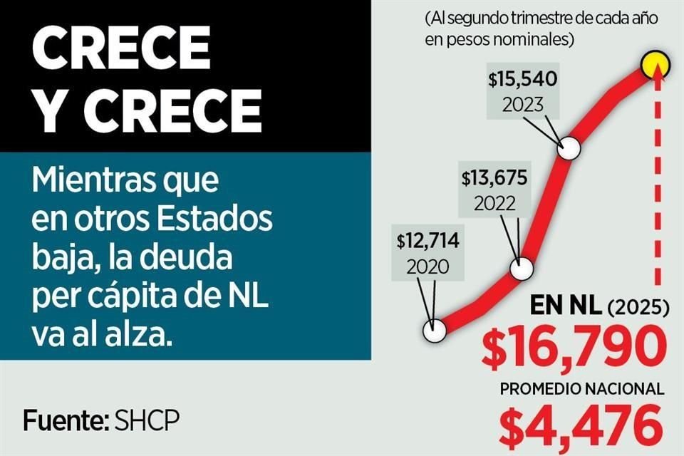 La deuda per cápita de Nuevo León volvió a ubicarse como la más alta del País, y ya cuadruplica al promedio nacional.