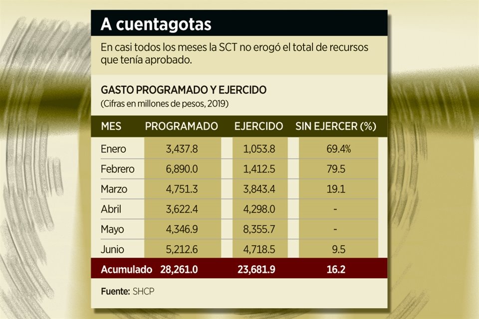 En el primer semestre del año, la Secretaría de Comunicaciones y Transportes (SCT) dejó de ejercer 16.2 por ciento del presupuesto federal que le fue asignado para este periodo.