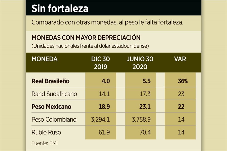 En el primer semestre del año, el peso se depreció en 22.3 por ciento, lo que lo colocó como la tercera moneda con mayor pérdida de valor de 39 divisas que analiza el Fondo Monetario Internacional (FMI).