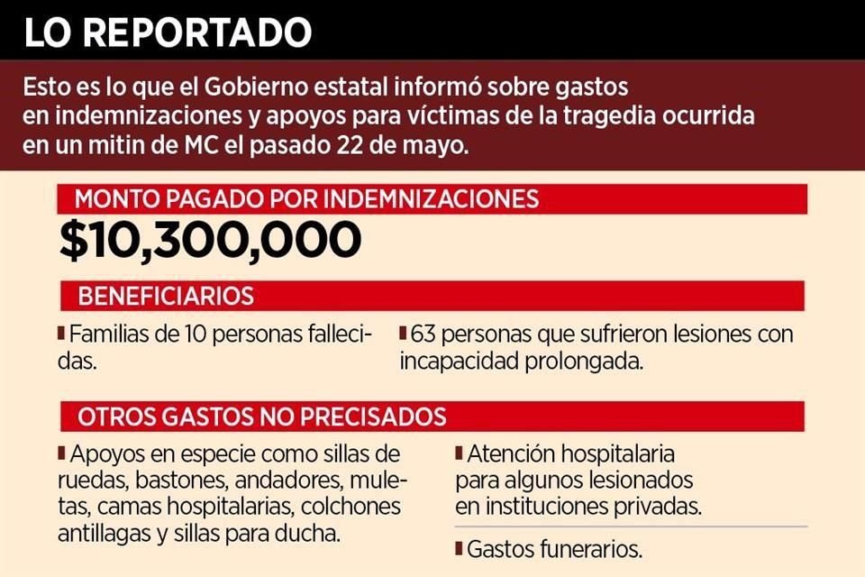 La tragedia registrada en un mitin de Movimiento Ciudadano en San Pedro le ha costado al Gobierno estatal al menos 10.3 millones de pesos, tan sólo en indemnizaciones a las familias de los 10 fallecidos y a las 63 personas que sufrieron lesiones con incapacidad prolongada.