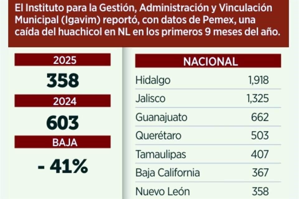 El robo de combustible en Nuevo León mediante tomas clandestinas presentó una reducción del 40.6 por ciento durante los primeros 9 meses del año, en comparación con el mismo periodo del 2024, reportó el Instituto para la Gestión, Administración y Vinculación Municipal (Igavim).