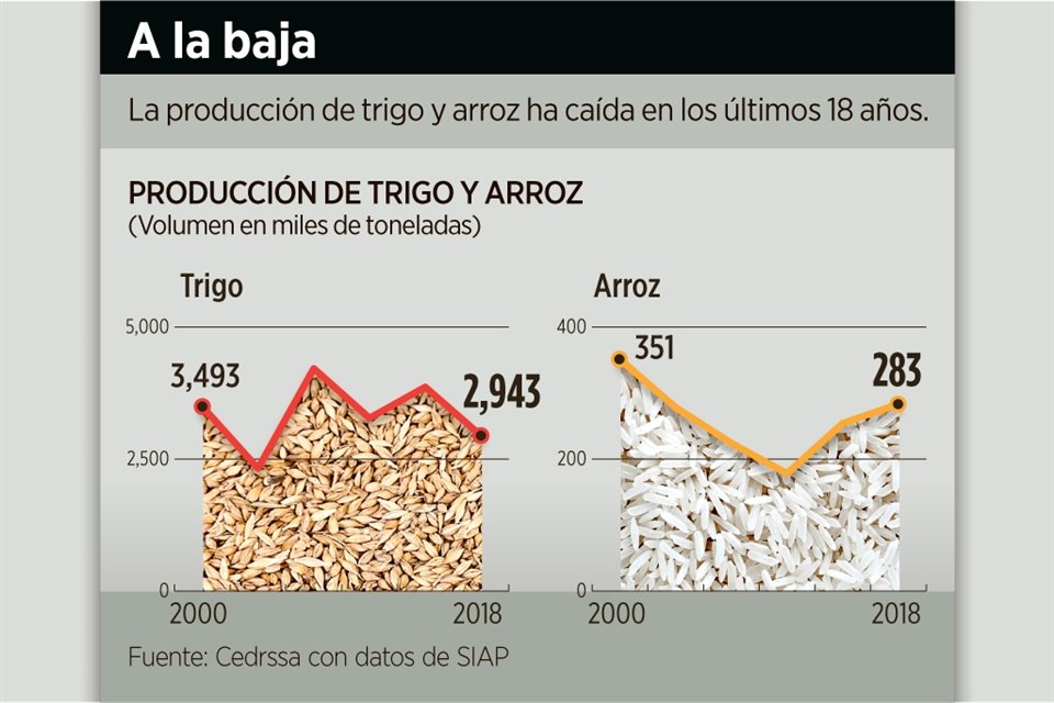 La producción nacional de trigo y arroz disminuyó 15.7 por ciento y 19.2 por ciento, respectivamente, de 2000 a 2018.