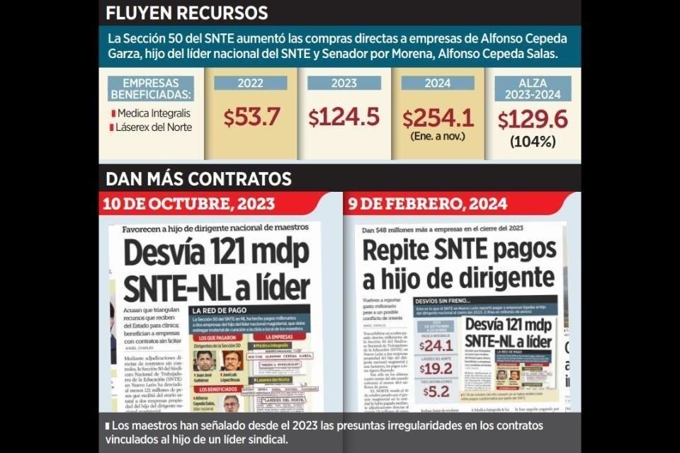 La Sección 50 del Sindicato Nacional de Trabajadores de la Educación (SNTE) en Nuevo León elevó al menos 104 por ciento los desvíos millonarios a dos empresas propiedad del hijo del dirigente nacional magisterial durante el 2024.