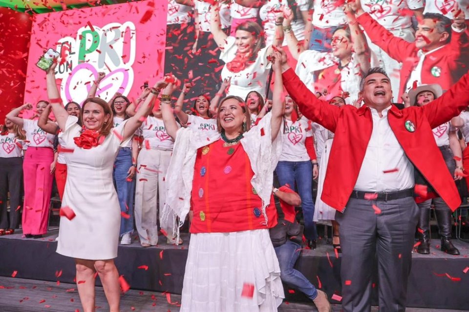 Ataviada con blusa roja y falda y rebozo blanco, Xóchitl Gálvez recibió un ruidoso y emotivo respaldo del PRI en la sede nacional del tricolor.