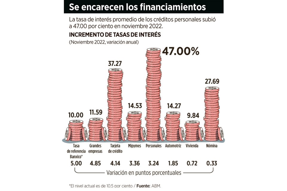 Quienes en noviembre pasado solicitaron un crédito bancario, sea persona o empresa, pagaron más que si lo hubieran hecho en el penúltimo mes de 2021, debido a las alzas que ha tenido la tasa de referencia para controlar la inflación y que en ese mes se ubicó en 10.00 por ciento y actualmente está en 10.50 por ciento.