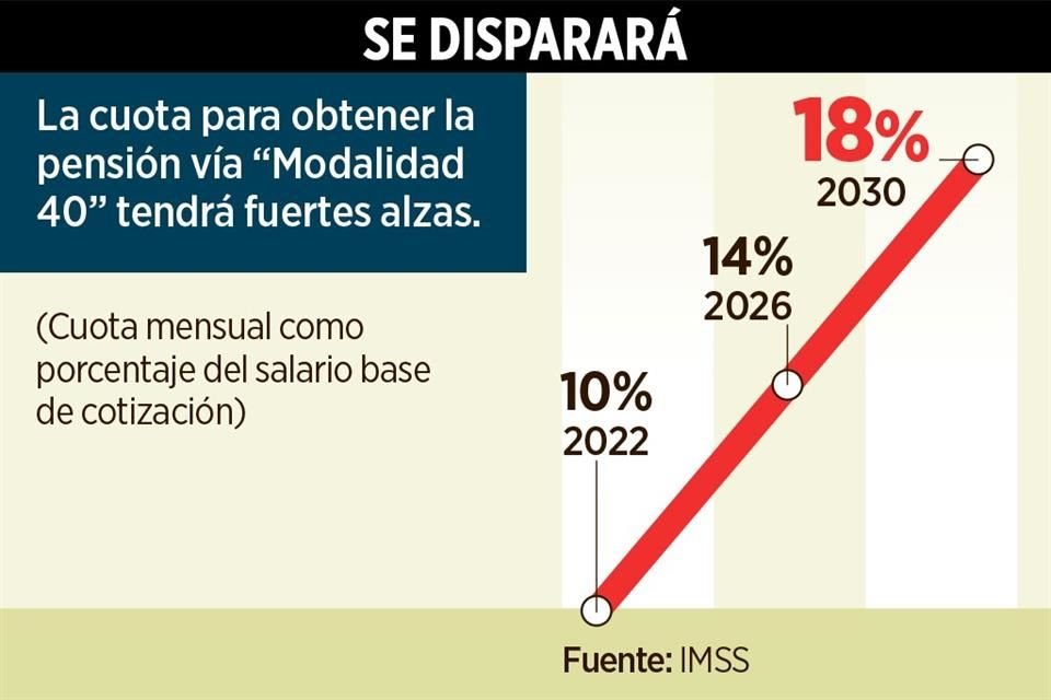 El costo de la llamada <a title='Tu pensión con la Modalidad 40: ¿te conviene?' href='https://www.reforma.com/tu-pension-con-la-modalidad-40-te-conviene/ar2419494' target='_blank'>'Modalidad 40'</a> para las pensiones aumentará hasta 10.8 por ciento a partir del próximo año tras las modificaciones a la Ley del Seguro Social del IMSS, que entrarán en vigor el 1 de enero de 2023.