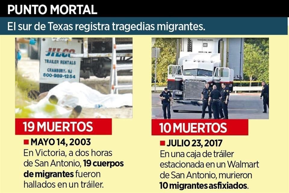La peor tragedia migratoria en Texas se registró ayer al ser abandonado un tráiler con al menos 64 personas, 50 de las cuales fallecieron por deshidratación, asfixia y golpe de calor dentro de una caja sin ventilación.