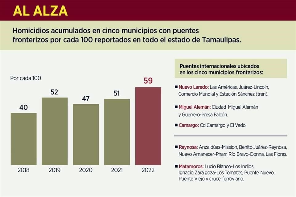 La pugna del crimen organizado por las aduanas en Tamaulipas se refleja en el alto nivel de violencia en cinco municipios que cuentan con puentes internacionales: Reynosa, Matamoros, Miguel Alemán, Nuevo Laredo y Camargo.