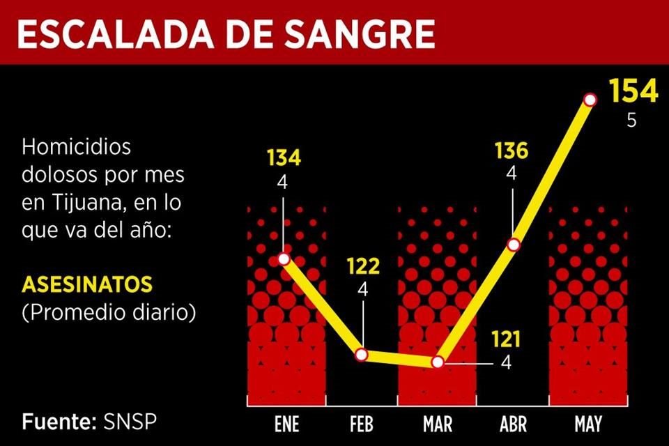Disputa entre cárteles de droga por el control de las Aduanas de Tijuana y Mexicali, en BC, elevaron niveles de asesinatos durante mayo. Crédito: Archivo
