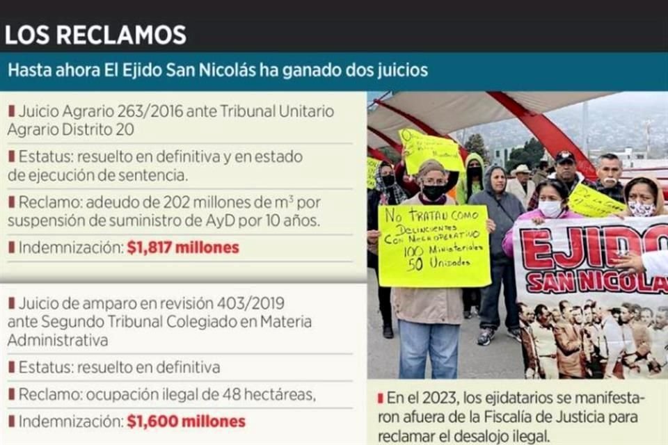 Mediante dos litigios, el Ejido San Nicolás reclama al Gobierno de Nuevo León, un monto de 3 mil 400 millones de pesos por concepto de indemnizaciones por agua no suministrada y la invasión de predios.