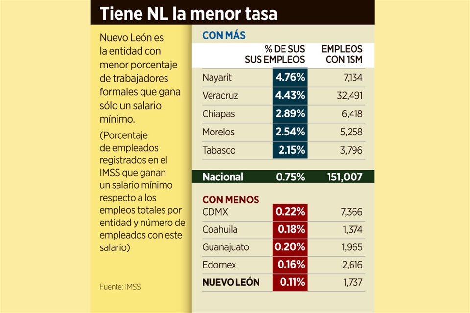En México solamente 151 mil 7 empleos formales a nivel nacional cotizan bajo un salario mínimo actual, lo que equivale apenas al 0.8 por ciento de las plazas totales registradas en el IMSS.