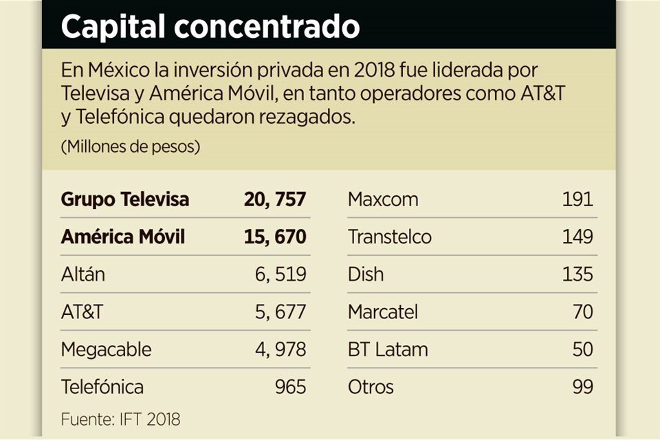 Grupo Televisa, América Móvil y Altán Redes fueron las empresas de telecomunicaciones en México que lideraron la lista de las que más invirtieron en el sector durante 2018, reveló el Instituto Federal de Telecomunicaciones (IFT).