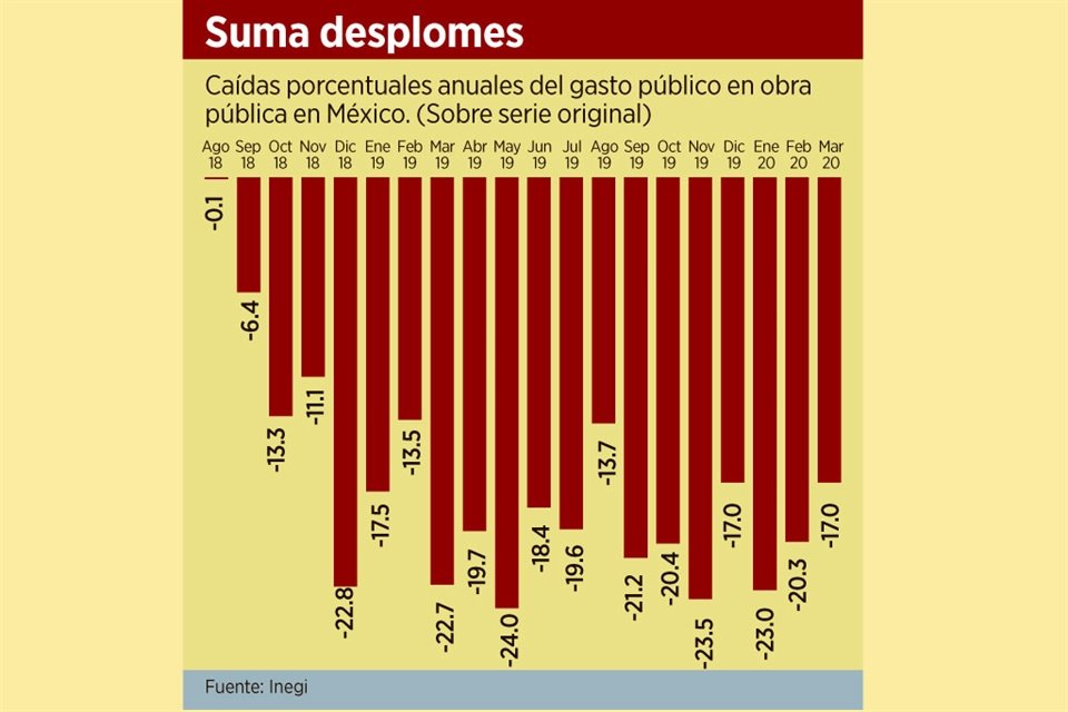 En marzo, y previó a los efectos generados por el Covid-19, el gasto público en obra en México ligó 20 caídas a tasa anual, ahora de 17 por ciento, y para el primer trimestre del año, la baja fue de 20.2 por ciento, revelan cifras del Inegi.