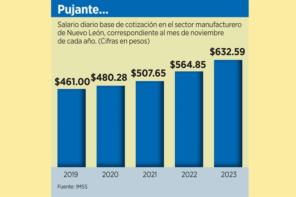 La escasez de mano de obra calificada, así como la llegada de empresas a Nuevo León por el nearshoring, apoyarían a que el salario diario base de cotización en el sector manufacturero mantenga tasas de crecimiento en alrededor del 12 por ciento anual.