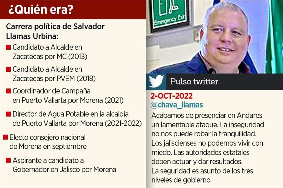 Salvador Llamas Urbina, consejero nacional de Morena, coordinador de Gabinete municipal de Puerto Vallarta y director del Servicio de Agua Potable, fue asesinado ayer durante una reunión en un restaurante en este municipio.