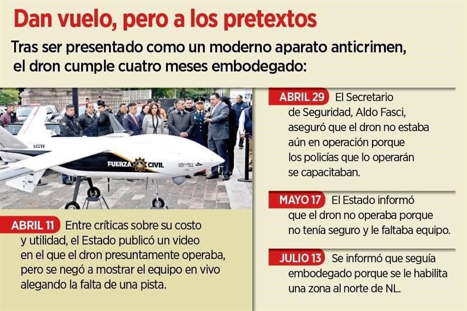 La Fiscalía Anticorrupción del Estado pudo, por fin, "inspeccionar" el dron al que la Administración del Gobernador Jaime Rodríguez atribuye un gasto de 57 millones de pesos, pero no tuvo acceso a sus componentes ni fue posible verlo en operación como pretendía.