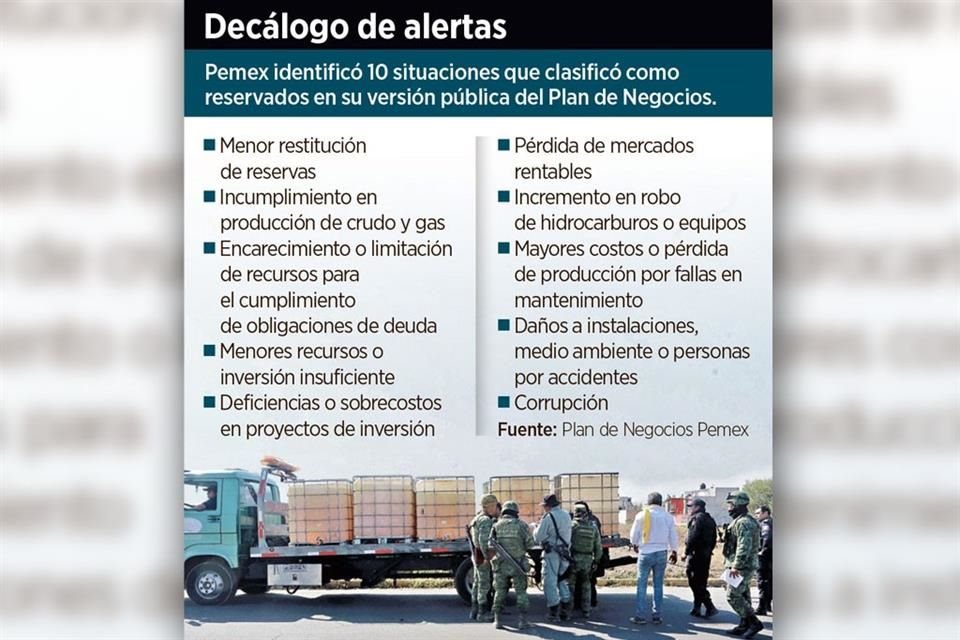 En la versión pública de su Plan de Negocios dado a conocer ayer, Pemex "ocultó" riesgos estratégicos de sus proyectos y las preocupaciones sobre corrupción, robo de hidrocarburos, retraso en obras, fallas de contratistas y escenarios en caso de que las calificadoras internacionales le bajen la calificación crediticia.